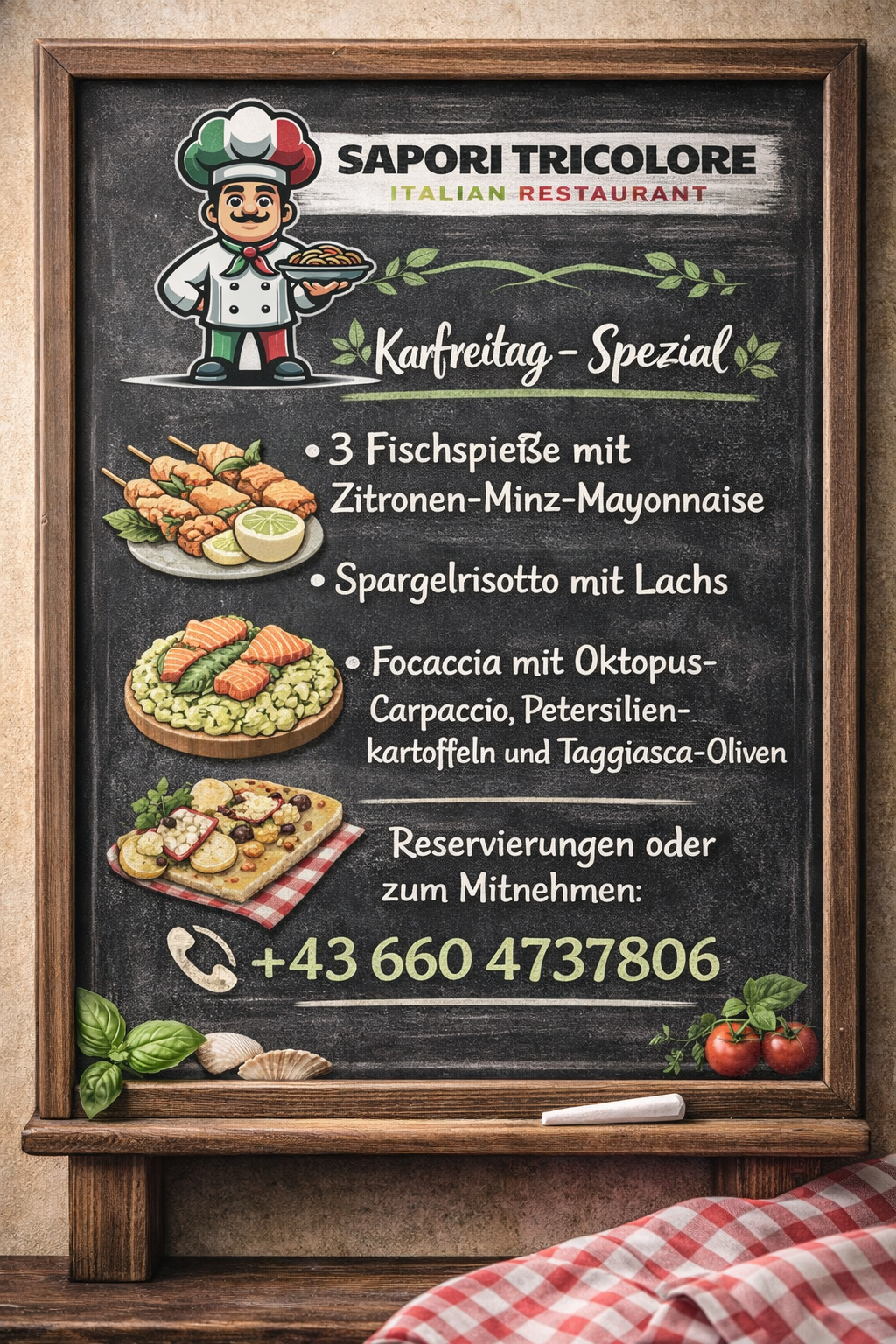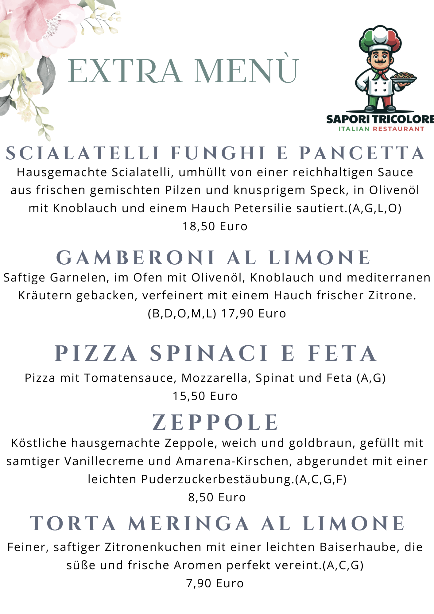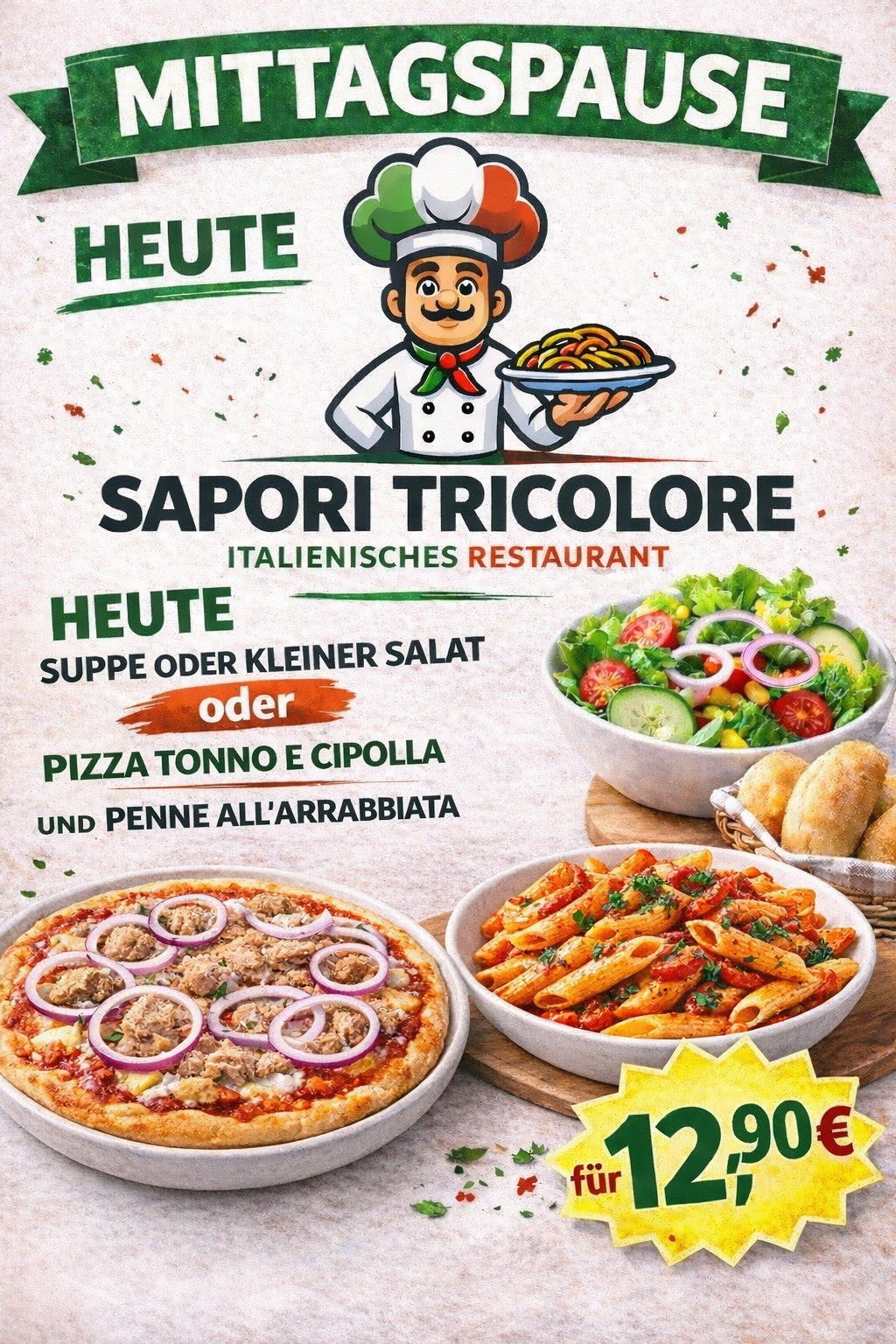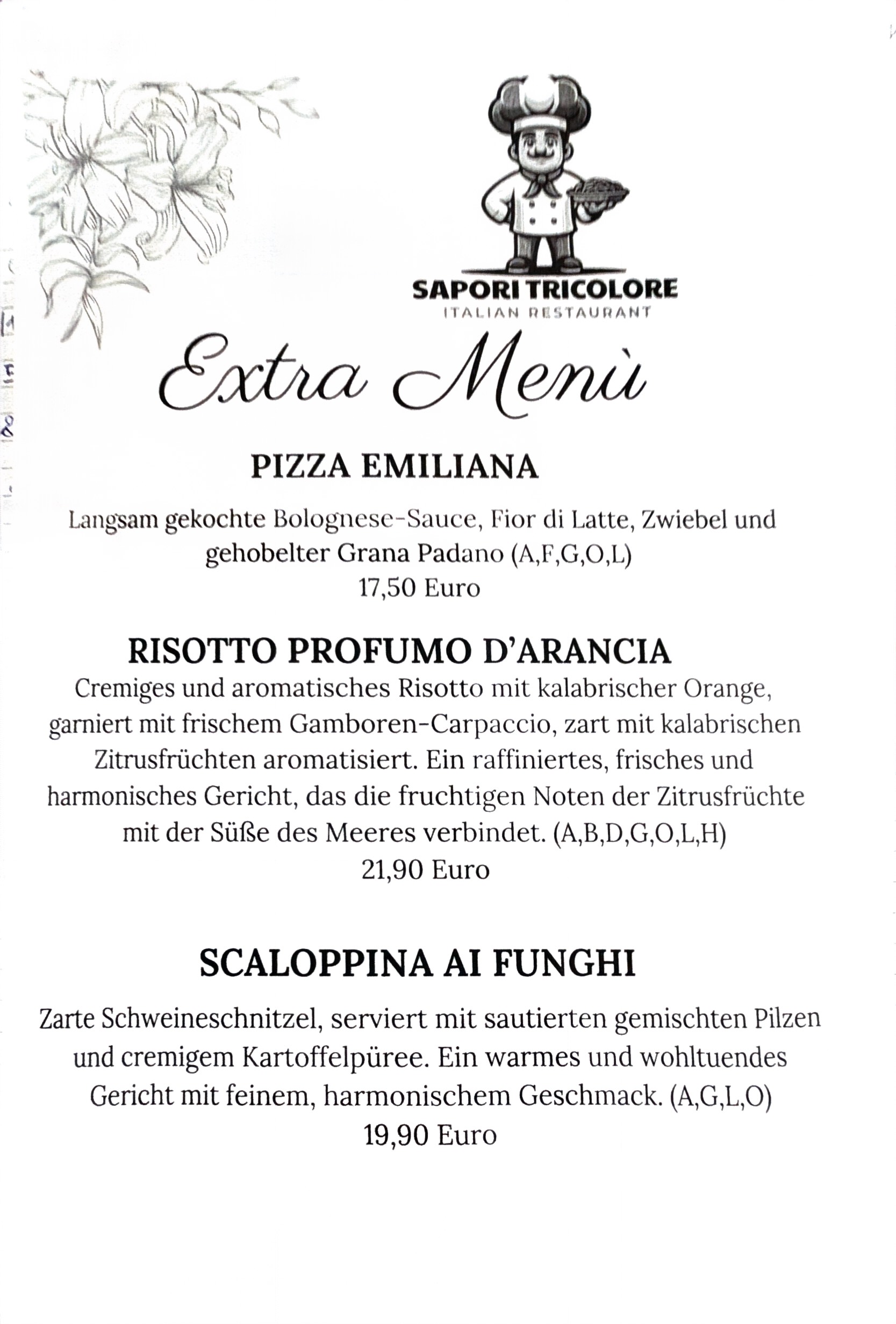 Ob Liebhaber der italienischen Küche ❤️🇮🇹 oder neugierig auf neue Ideen 🤩 – bei Sapori Tricolore finden Sie immer etwas Besonderes ✨. Entdecken Sie unsere saisonalen Menüs 🌸🍂, Tagesempfehlungen 📋 und besonderen Gerichte außerhalb der Karte ⭐ und genießen Sie Italien mit allen Sinnen 🍽️.